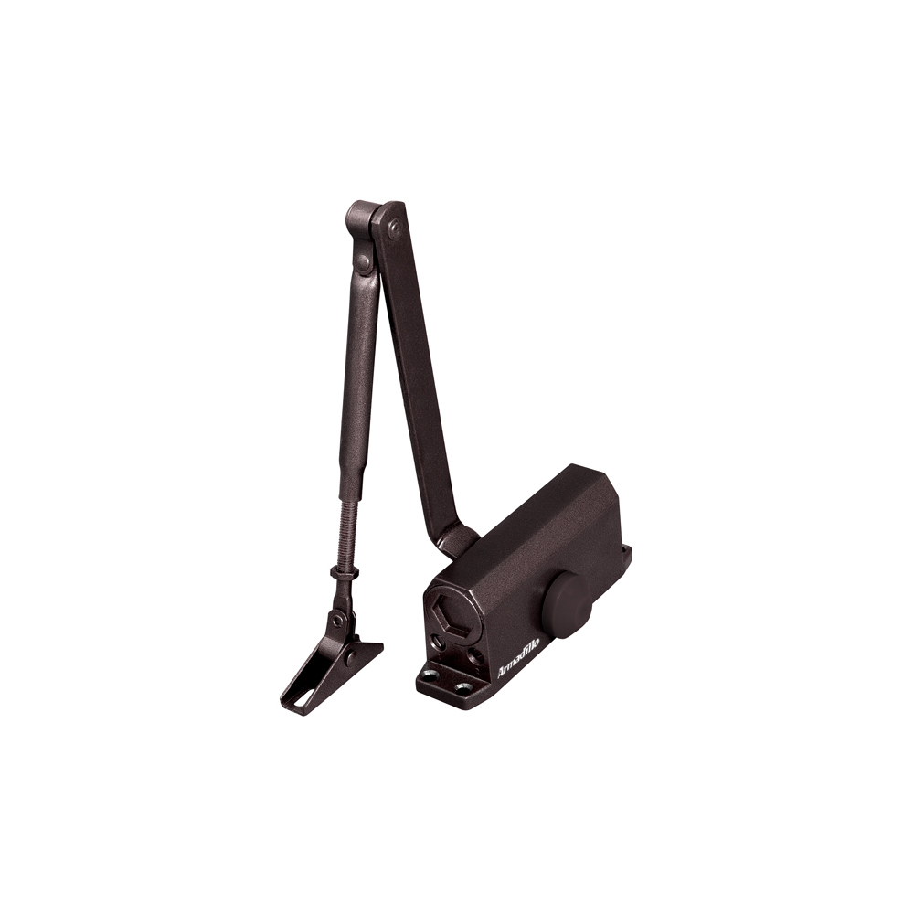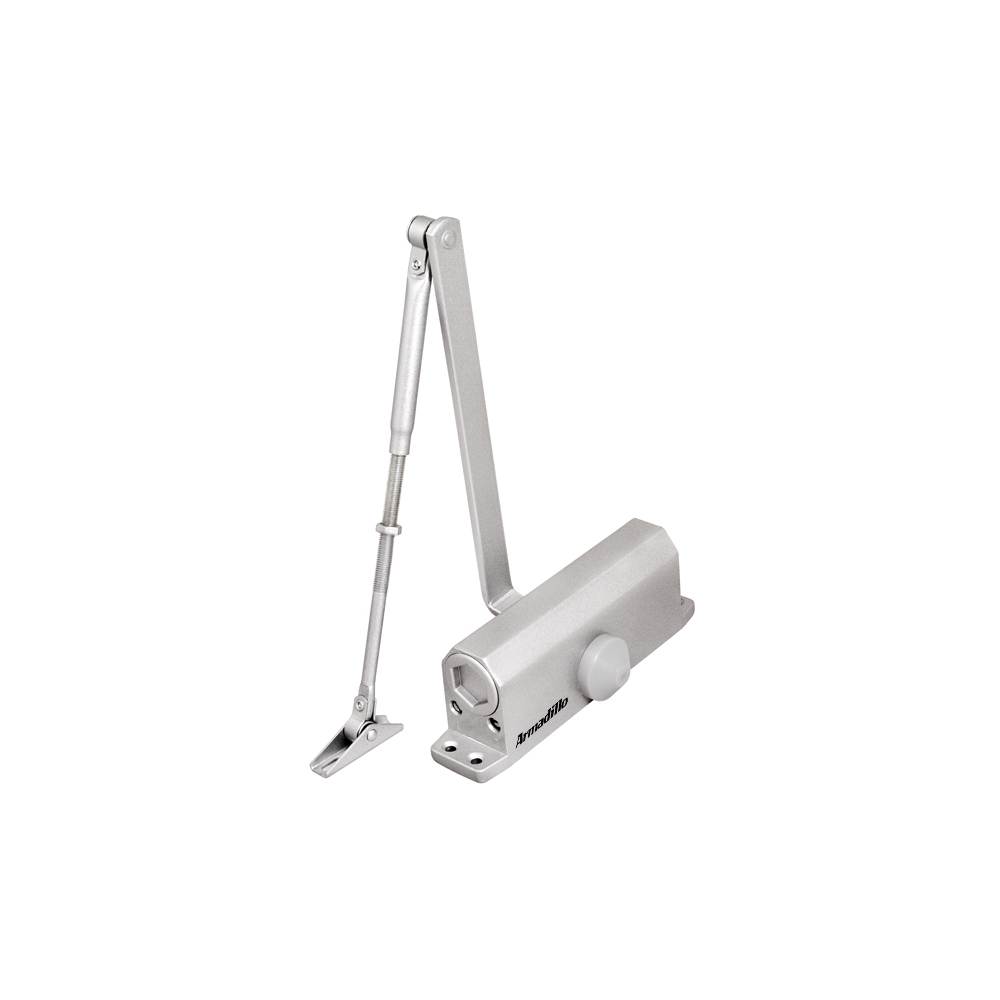 Доводчик с рычагом — наиболее распространенный механизм. Благодаря оптимальному соотношению цены, характеристик и долговечности ее используют для установки на входных и внутренних дверях в помещениях с большим потоком людей. Они предназначены для интенсивной эксплуатации и не выходят из строя при частом открывании и закрывании полотна.