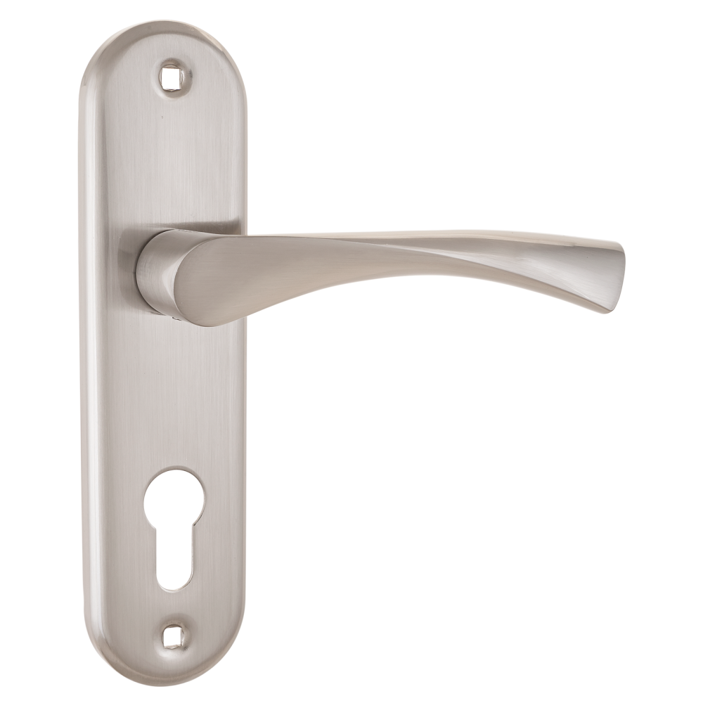 Фурнитуру собирают в виде накладки с отверстием под замок (или с запорной вертушкой) и ручкой. В отличие от варианта на розетке, состоящего из двух отдельных частей, здесь все элементы собраны в сплошной нажимной гарнитур — это второе название для ручек–планок.